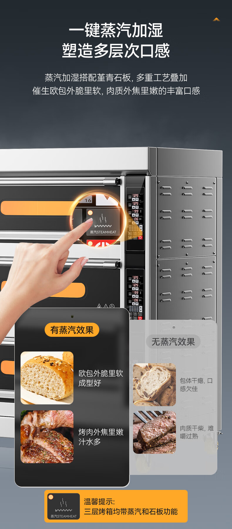 首頁 > 商廚產(chǎn)品 > 蒸烤箱 > 烘焙烤箱 >麥大廚豪華款三層六盤蒸汽石板專業(yè)烘焙烤箱25.8KW