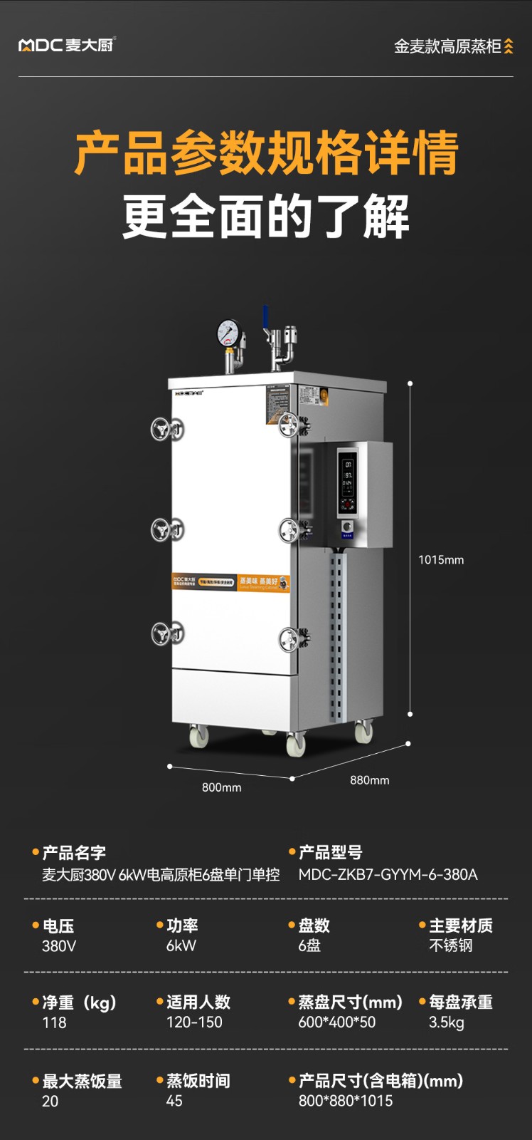 麥大廚金麥款6盤電熱380V單門高原蒸柜6KW