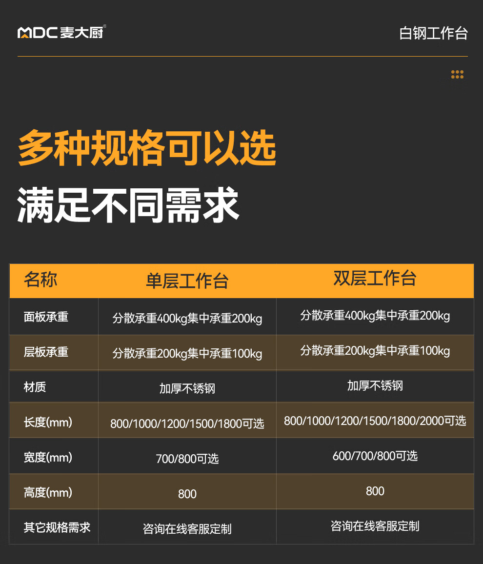 - 更多MDC商用雙層工作臺規(guī)格咨詢在線客服