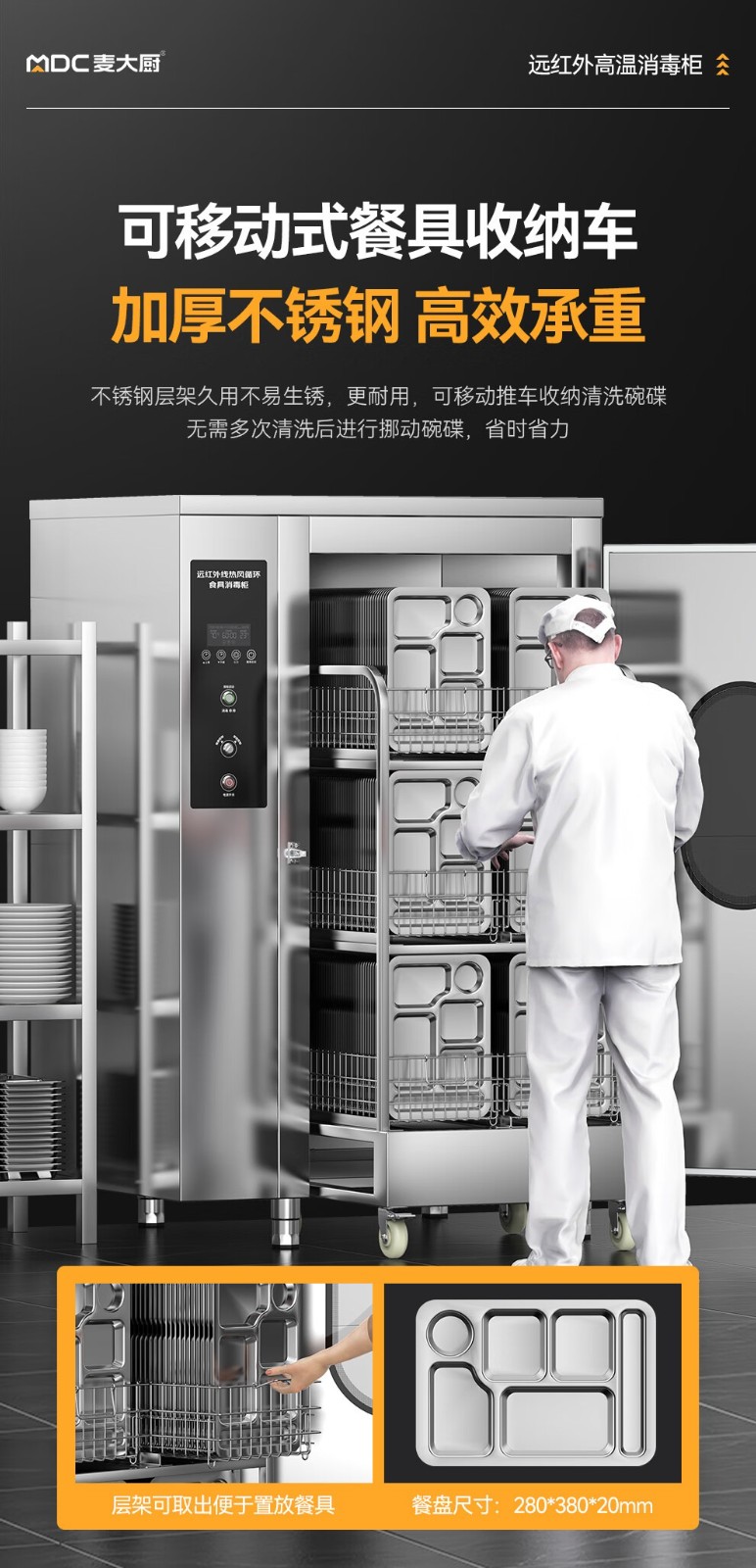 麥大廚380V工程款單門單控3層推車式遠(yuǎn)紅外線熱風(fēng)循環(huán)高溫消毒柜4.5KW