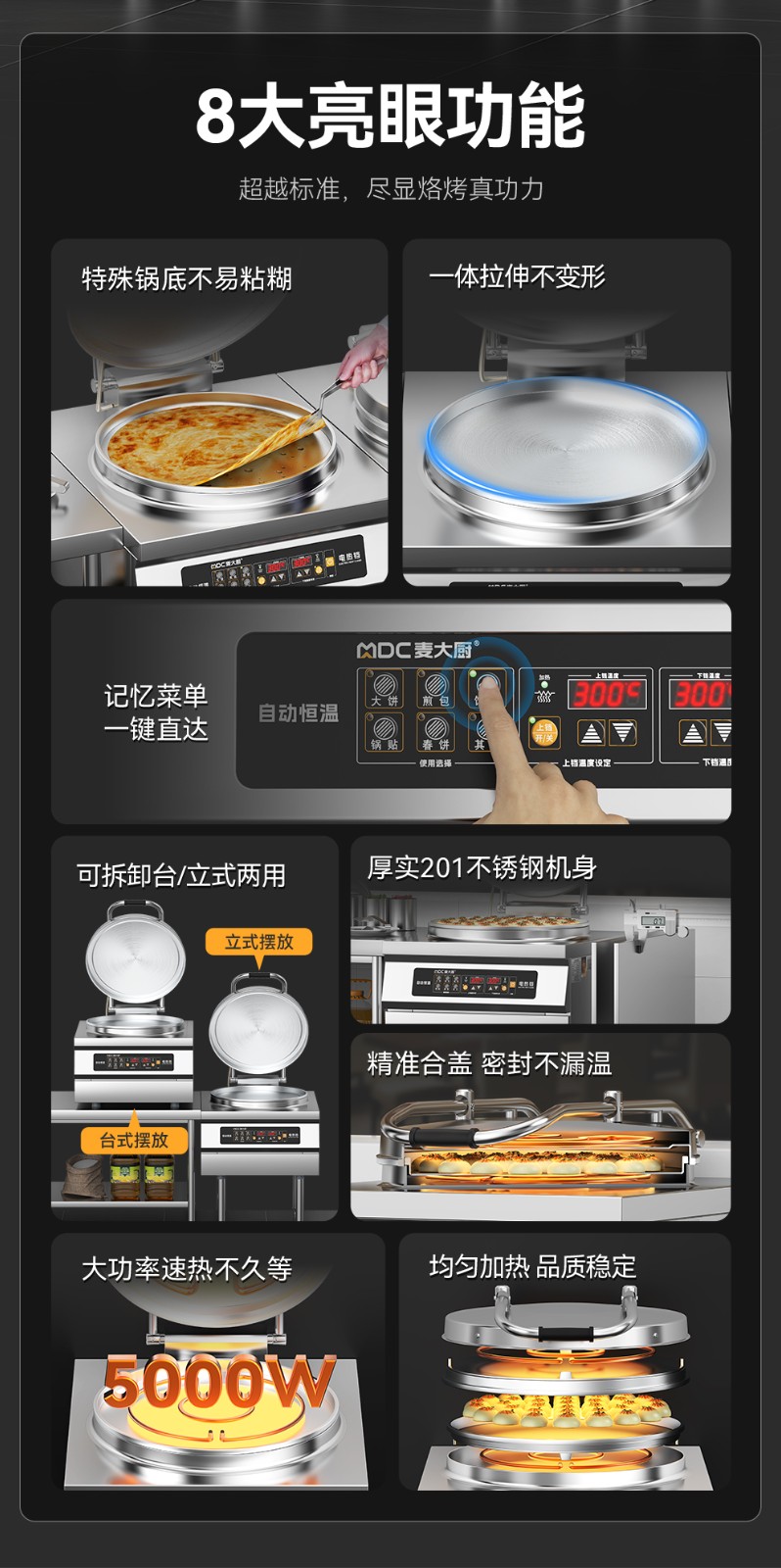 首頁(yè) > 商廚產(chǎn)品 > 電餅鐺 > 立式電餅鐺 >麥大廚商用電餅鐺大型雙面加熱立式電腦款鐵/鋁鍋
