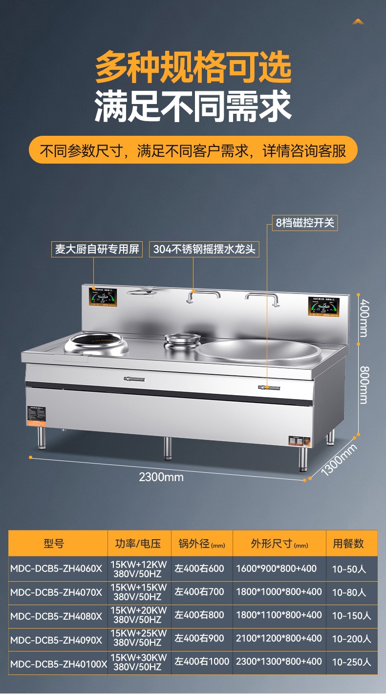 首頁(yè) > 商廚產(chǎn)品 > 電磁灶 > 大小組合爐 >麥大廚星麥款左400右1000大小組合爐商用